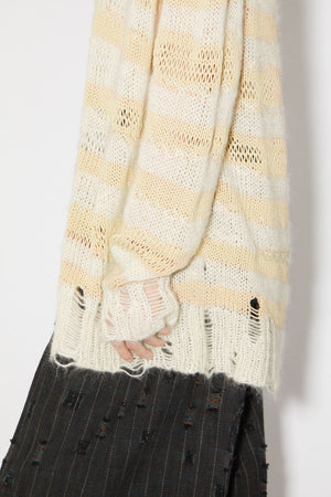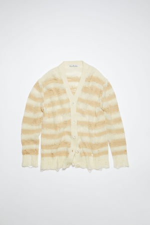 Acne Studios off white/ecru cardigan features an all-over stripe pattern, detailed with a v-neckline and a centre front button-up closure. Adorned with irregular stitching and distressed details on the cuffs and hem. Cut to a relaxed fit with a hip length.