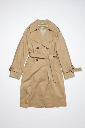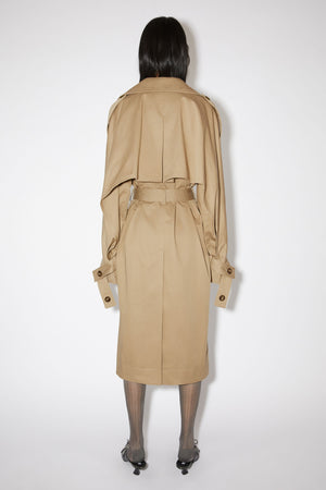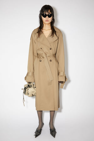 Acne Studios cold beige double-breasted trench coat is crafted from cotton twill, with a front button and knotted belt closure. Detailed with raglan sleeves, pleated inserts at the back and welt pockets. Cut to an exaggerated fit with a mid-length.