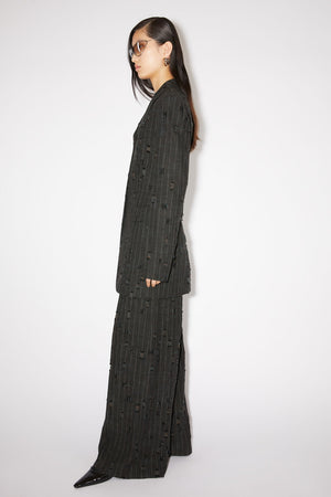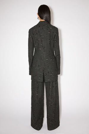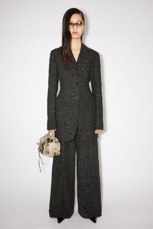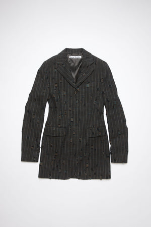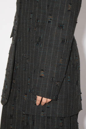 Acne Studios anthracite grey single-breasted suit jacket features a pinstripe pattern with distressed details. Complete with a button closure, chest pocket and jetted flap pockets at the front. Cut to a fitted fit with constructed shoulders and below hip length.