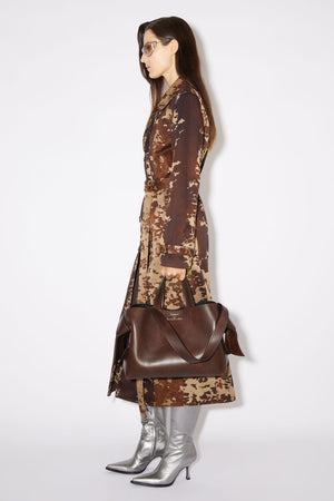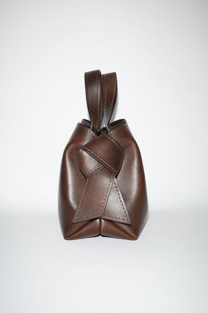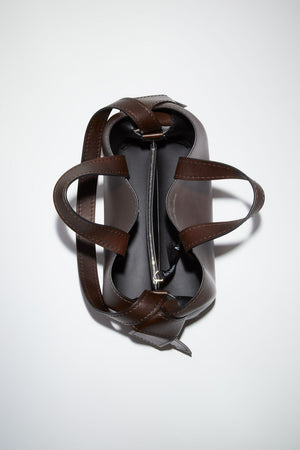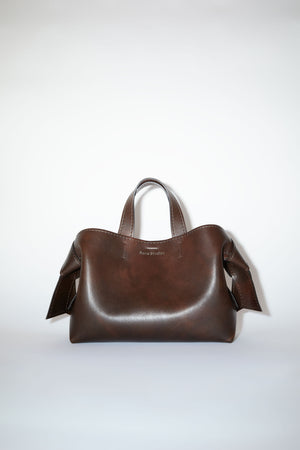 Acne Studios dark brown midi tote bag is made of soft tanned leather and is adorned with twisted musubi knots on each side, inspired by traditional Japanese obi sashes. Completed with a middle zippered pocket compartment and a discrete magnetic closure.
